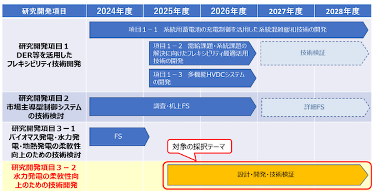 今回の事業では、こうしたノンファーム型中小水力発電とファーム型大規模水力発電を対象に、NEDOの「電源の統合コスト低減に向けた電力システムの柔軟性確保・最適化のための技術開発事業(日本版コネクト&マネージ2.0)」の一環として、新たに「水力発電の柔軟性向上のための技術開発」に着手する。