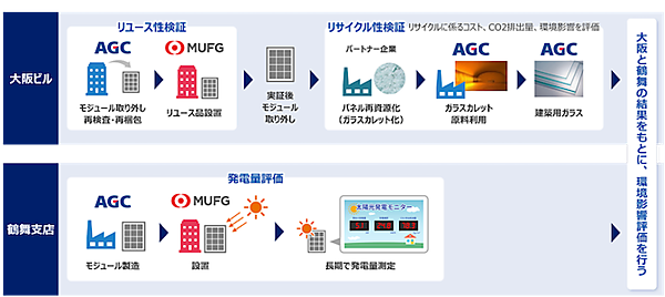 大阪ビルでは、AGCが使用したリユース品を設置し、リユース性を検証するとともに、使用済みモジュールをガラスの材料である「ガラスカレット」に再資源化できるかを探る。リユースとリサイクルの段階におけるコスト、CO2排出量、環境影響を評価する。