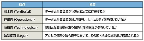 コンサルティング会社のマッキンゼーは、「ソブリン性」を理解するためには、表1に示す4つの観点で理解する必要があると主張している。