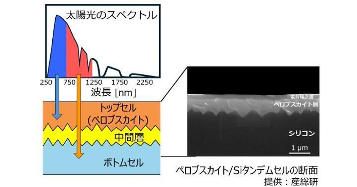 タンデム型ペロブスカイト太陽電池は、ペロブスカイト太陽電池と異なる波長帯の光を吸収する太陽電池の2つを積み重ねることで、太陽光を無駄なく吸収し、発電効率を高める。既存のシリコン太陽電池の置換えが期待されているが、技術開発で中国が先行している。