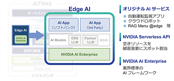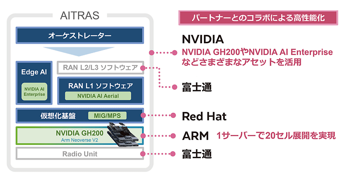 AITRASは、RAN(無線アクセスネットワーク)とAI(人工知能)を同一のコンピュータプラットフォーム上で動作可能にする統合ソリューションである。大容量、高性能、高品質なRANをキャリアグレード注1で提供するほか、同時に生成AIなどのAIアプリケーションの効率的な処理と運用を目標に開発が進められている。これによって、通信サービスのほかにAIを活用した各種通信サービスやAI処理単独のサービスの提供などを目指す。