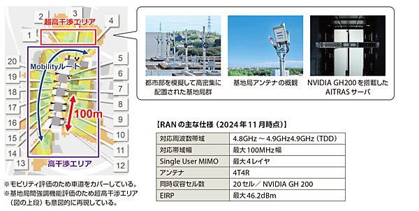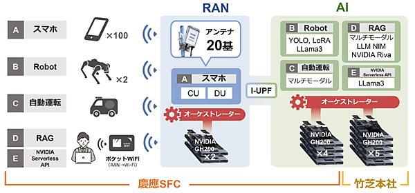 図3のように、SFCでは都市部を想定して意図的にアンテナを高干渉となるように設置しているが、この環境下で100台のスマートフォンを使って同時アクセスを行い、トラフィックの状況や消費電力などを確認している。この「RANパート」と以降で述べる「EdgeAIパート」は、I-UPF(Intermediary User Plane Function、データ転送レイヤ。図2参照)で直結され、通信とAIそれぞれの要求に応じた機能やパフォーマンスを提供する。