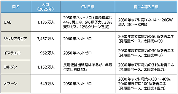 表1は、UAEおよび太陽光発電の導入が進む主な中東諸国について、カーボンニュートラル(CN)目標と再エネ導入に関する政策目標を整理したものである。あわせて、各国の規模感を示すために人口も併記した。