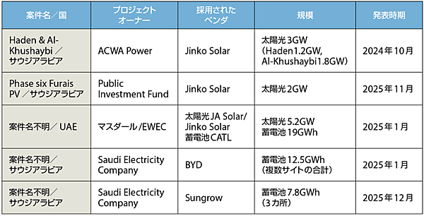 表2に示す通り、近年発表された中東の太陽光発電、蓄電池、ならびに両者を併設した案件では、世界最大級の規模をもつプロジェクトが相次いでおり、その多くで中国企業が主要機器を供給している点が特徴である。中国企業の立ち位置は明確であり、価格競争力と供給能力を武器に、国家主導プロジェクトを支える大量導入フェーズの中核を担う機器供給者である。