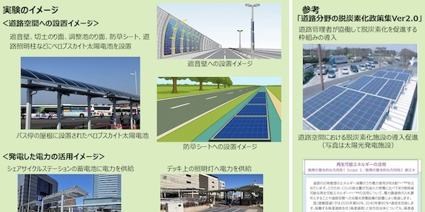 今回の事業では、ペロブスカイト太陽電池を道路空間に設置し、実証実験を実施する。具体的には、発電性能や施工性、耐久性、景観性、道路管理への有効性、発電電力の活用方法を検証する。