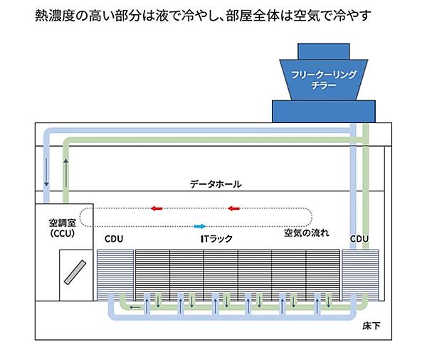 図2 データセンターにおける「空冷方式」(CCU)+「液冷方式」(CDU)のシステム構成イメージ(※ 熱濃度の高い部分は液で冷やし、部屋全体は空気で冷やす)