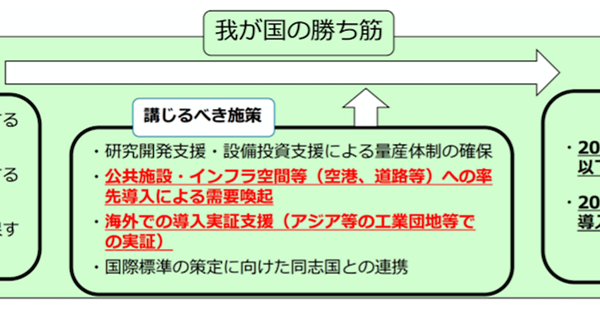 さらに、公共施設や空港や道路などのインフラ空間にいち早く導入を進め、需要喚起につなげる意向だ。自治体に対しては、国庫補助を活用して公共施設などに導入する事業を対象に、新たな地方財政措置を実施する予定である。