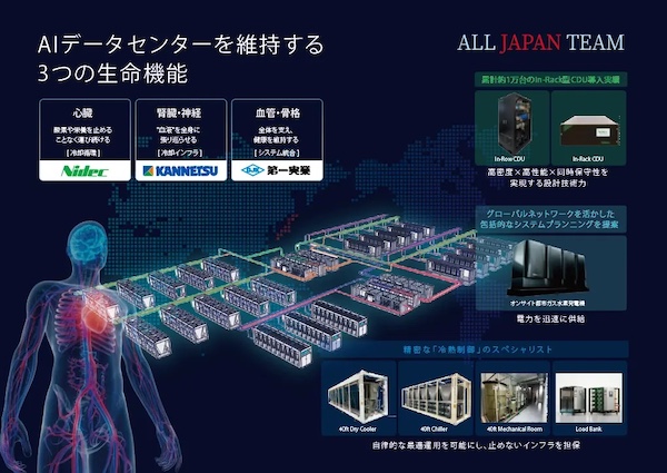 今回の3社提携では、各社の専門機能を統合することで、これらの課題解決を目指す。ニデックは世界シェアを持つモーター制御技術を基盤としたCDU注2などの高信頼性製品を供給する。第一実業は総合商社としての調達力に加え、エネルギー基盤から施工までを統括するプランニングを担う。カンネツは冷却システム全体の精密な自律制御に加え、1MW超の高負荷環境を再現するロードバンク注3を用いた、実装前のシミュレーションおよび実証検証を担当する。