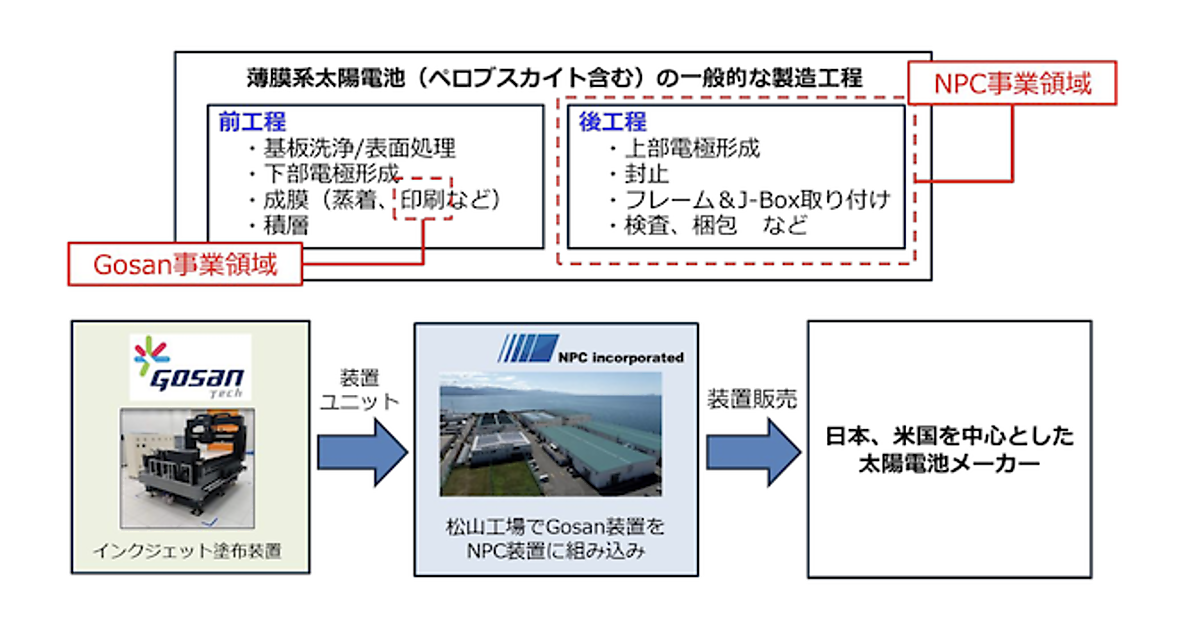 今後、Gosanがインクジェット装置・ユニットをNPC松山工場に納入し、NPCが製造ライン全体の設計・構築を担う。NPCの販売ネットワークの活用に加え、NPC側がGosanの与信面を補完することで、日本国内および米国市場を中心としたペロブスカイト太陽電池メーカーへの販売を強化する。