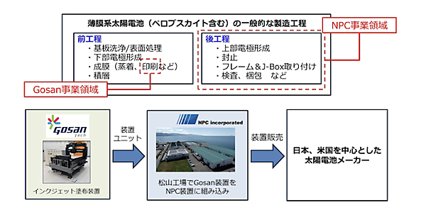 NPCはこれまで、太陽光パネルの「後工程」に関わる装置提供を中心に事業を展開してきた。2025年9月からGosanと業務提携し、提携直後に2件の受注を獲得するなどの一定の成果が出ており、今回の資本参加を決定した。今回の出資により、Gosanが強みを持つ「前工程」のインクジェット塗布技術を自社ラインに組み込む。これにより、成膜から最終製品化までを網羅した製造ラインの提供体制を構築する。