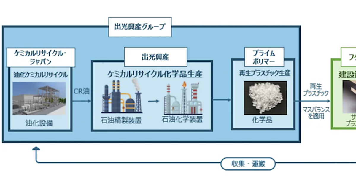 出光興産株式会社(以下、出光興産)、株式会社竹中工務店(以下、竹中工務店)、ケミカルリサイクル・ジャパン株式会社(以下、CRJ)、フクビ化学工業株式会社(以下、フクビ化学)、株式会社プライムポリマー(以下、PRM)の5社は、使用済みプラスチックを原料とした再生プラスチックを建設資材へ適用することに成功した(図1)。油化技術を用いてバージン材と同等の品質を確保し、建設現場の廃棄物を再び資材として循環させる。出光興産が2026年4月10日に発表した。