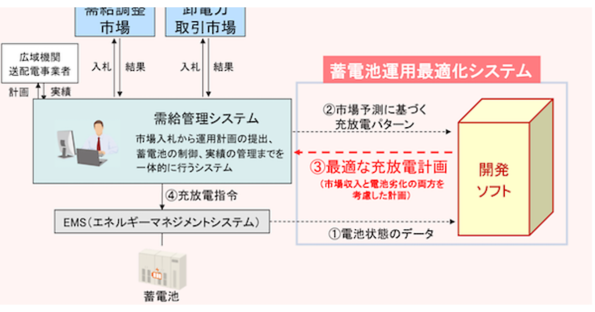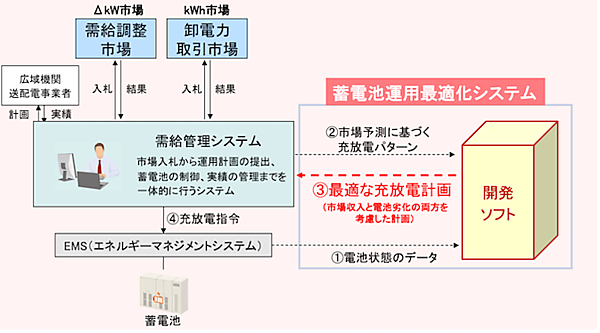 共同開発する蓄電池運用最適化システムは、運転条件、電池の状態、需給調整市場注1や卸電力取引市場注2の価格、電力需要予測という4つの情報を解析し、市場収入と電池劣化の両方を考慮した計画を作成する。これを、入札や運用計画の提出、蓄電池の制御を統合管理する需給管理システムに送信する。