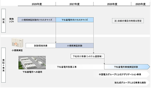 2026年に研究を開始し、2027年度の小規模実証を経て、2028年度以降には中国電力の下松蓄電所(山口県下松市)へ実装する計画だ(図2)。