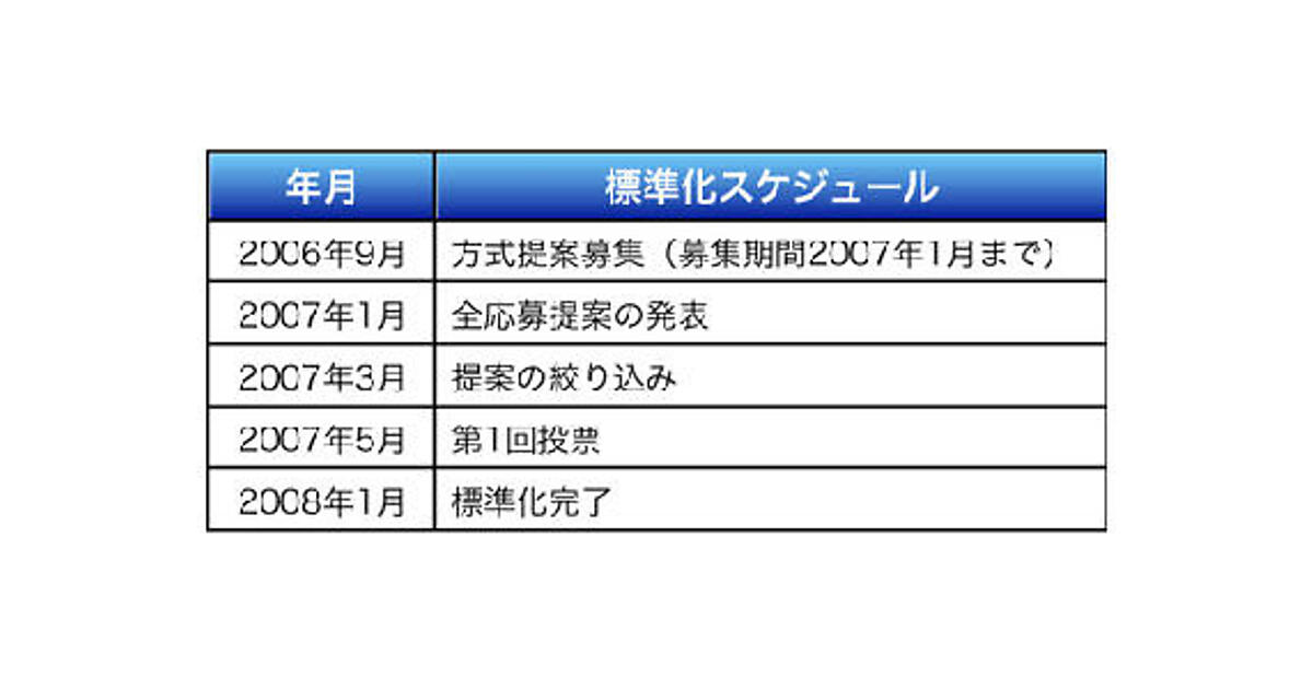 従来どおり変更はない。次回の米国・オーランド会合(3月11~16日開催)で方式提案の一部を発表する。CFPの締め切りは、2007年5月会合(カナダ・モントリオール)の1週間前(5月7日)で、その5月会合で全応募提案が発表される。それを受け、2007年7月(米国・サンフランシスコ)に提案の絞り込みが実施され、標準化完了は2008年5月を予定している(表1)。