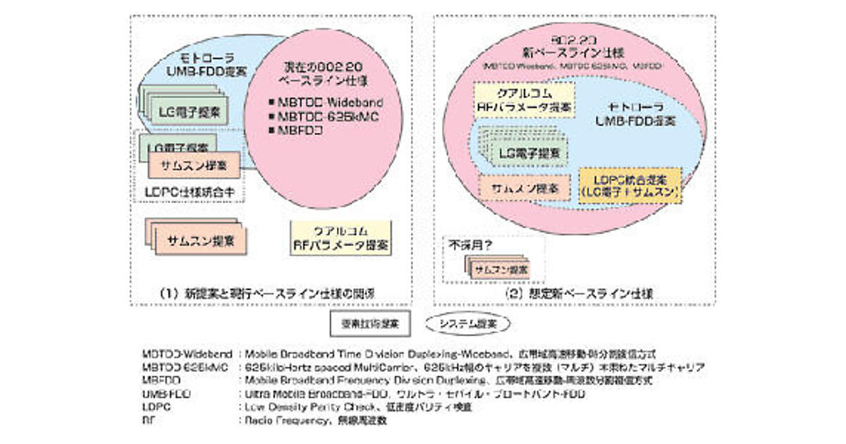 2007年3月に、モトローラ社が802.20に提案したUMB-FDDベースのシステム提案は、2006年1月の802.20ベースライン仕様をもとに3GPP2で改良が加えられたものである。802.20標準化が紛糾していた2006年後半には、802.20技術を核として、3GPP2 Evolution Phase-2の方式審議が着々と進んでいた。