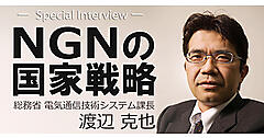 ITU-T勧告であるNGNリリース1に基づいたNGNのフィールド・トライアル(実証実験)が、NTTによって開始されるなど、NGNは商用化に向けて大きく動き始めました。そこで、総務省 総合通信基盤局 電気通信事業部 電気通信技術システム課長の渡辺 克也氏に、NGNに関する日本の国家戦略をお聞きしました。渡辺課長は、これまで政府のe-Japan戦略やu-Japan政策づくりに参画しながら情報通信研究機構(NICT)で多彩な研究活動を展開。現在、NGNの標準化をはじめ、日本政府のIT戦略の最前線でリーダーシップを発揮しています。インタビュー内容は、e-Japan戦略からNGNへ、また諸外国の動向をとらえながらNGNの国家予算と、NGNの次にくるNWGN(新世代ネットワーク)の展望にいたるまで多岐にわたっています。