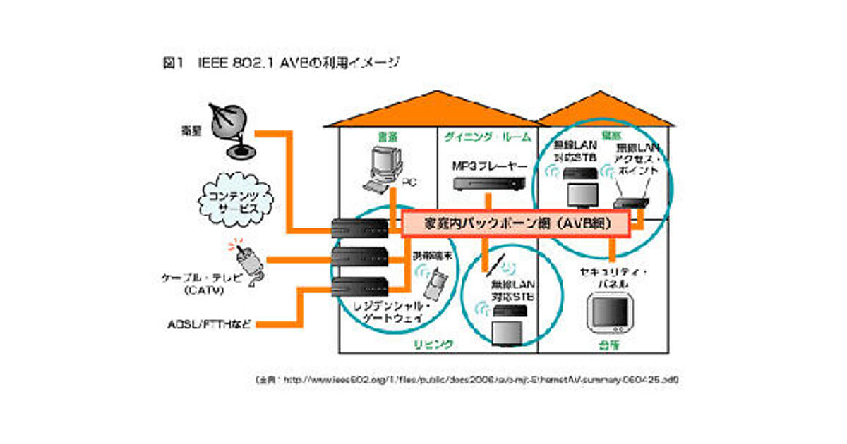 802.1 AVB(オーディオ・ビデオ・ブリッジ方式)は、家庭内のオーディオ・ビデオ機器に代表されるマルチメディア機器やパソコンを接続し、音楽や高精細な動画のストリーム・トラフィックをやりとりするための方式を規定する方式である。広く普及したイーサネットを活用して、家庭内のオーディオ機器やビデオ機器、パソコン、レジデンシャル・ゲートウェイ、セット・トップ・ボックス(STB)など、あらゆるマルチメディア機器をつなぐための「家庭内バックボーン網」を提供しようというものである(図1)。