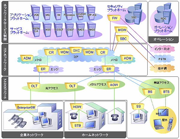 オプティカル・コアおよびメトロにおいては、GMPLS(光対応のMPLS)を実装したオール光クロスコネクト装置であるカリエント・ネットワークス(Calient Networks)社の「DiamondWave」、ノーテルネットワークス社のマルチサービスエッジ「OME6500」と、シスコシステムズ社のマルチサービスプロビジョニングプラットフォーム「ONS15454」、コリジェントシステムズ(Corrigent Systems)社のPacket ADM(Add/Drop Multiplexer)を提供しています。また、IPコアおよびIPエッジには、シスコシステムズ社の各種ルータ、日立電線株式会社のサービスプロバイダ向けシャーシ型L2スイッチ「Apresia?18000シリーズ」があります。また、既存ネットワークとの接続に必須となるNGNマイグレーション商品として、メディア・ゲートウェイ等も提供しています。