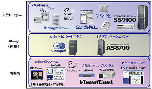 IPテレフォニーの具体的な製品としては、2万人規模の企業内IPセントレックスを実現するIPテレフォニーサーバ「IP CONVERGENCE? Server SS9100」、大規模オフィスのハイブリッドIP-PBX「DISCOVERY?01」、中小規模オフィスに最適なIP&モバイル ビジネスホン「IPstage?シリーズ」、豊富な導入実績を持つVoIPゲートウェイ「BVシリーズ」、安価で高セキュリティを実施するARUBA社のハイセキュリティな無線LANシステム商品やVoIP対応無線LANアクセスポイント「MWINS?」などがあります。更に業務アプリケーション連携などにより、いつでも・どこでも・誰とでも、快適なコミュニケーションが可能なオフィス環境を提供する「IP CONVERGENCE? Server AS8700」があります。また、国内トップクラスの導入実績を誇るIPコンタクトセンター「CTstage?」、汎用ビデオ配信サーバ映像配信統合プラットフォーム「OKI MediaServer」、高品質なビデオ会議システム「VusualNexus?」があります。