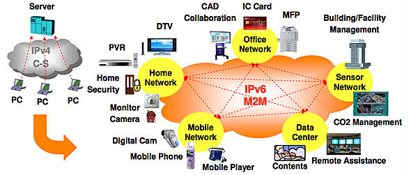 具体的には、図2に示すような、現在のIPv4ベースのクライアント-サーバ型モデルの片方向通信のサービスから、IPv6ベースのm2m-x(Machine to Machine-x)への展開を示した。