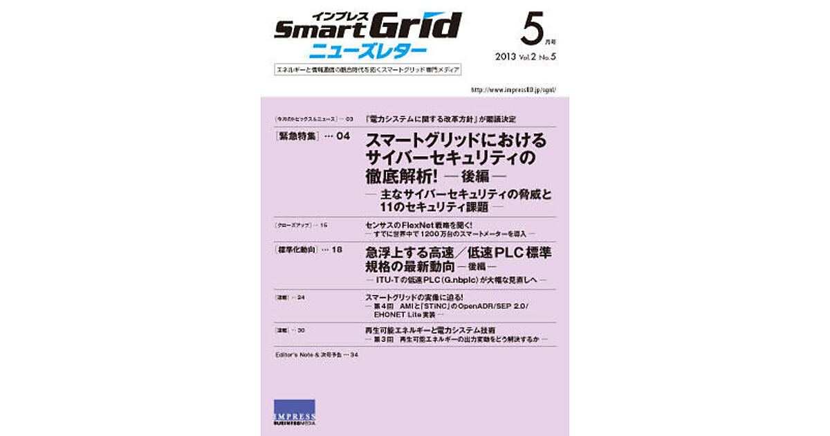 2013年5月号 再生可能エネルギーと電力システム技術 再生可能エネルギーと電力システム技術 平田 英成2013年5月1日 0:00 再生可能エネルギー スマートグリッドの実像に迫る! スマートグリッドの実像に迫る! 平田 英成2013年5月1日 0:00 スマートグリッド 急浮上する高速/低速PLC標準規格の 最新動向 ─後編─ 平田 英成2013年5月1日 0:00 エネルギー管理 センサスの「FlexNet」戦略を聞く! インプレスSmartGridニューズレター編集...2013年5月1日 0:00 スマートグリッドクローズアップ 電力の自由化、オープン化に向け「電力システムに関する改革方針」が閣議決定 インプレスSmartGridニューズレター編集...2013年5月1日 0:00 政策トピックス スマートグリッドにおける サイバーセキュリティの徹底解析! スマートグリッドにおけるサイバーセキュリティの徹底解析!─後編─ 平田 英成2013年5月1日 0:00 サイバーセキュリティ