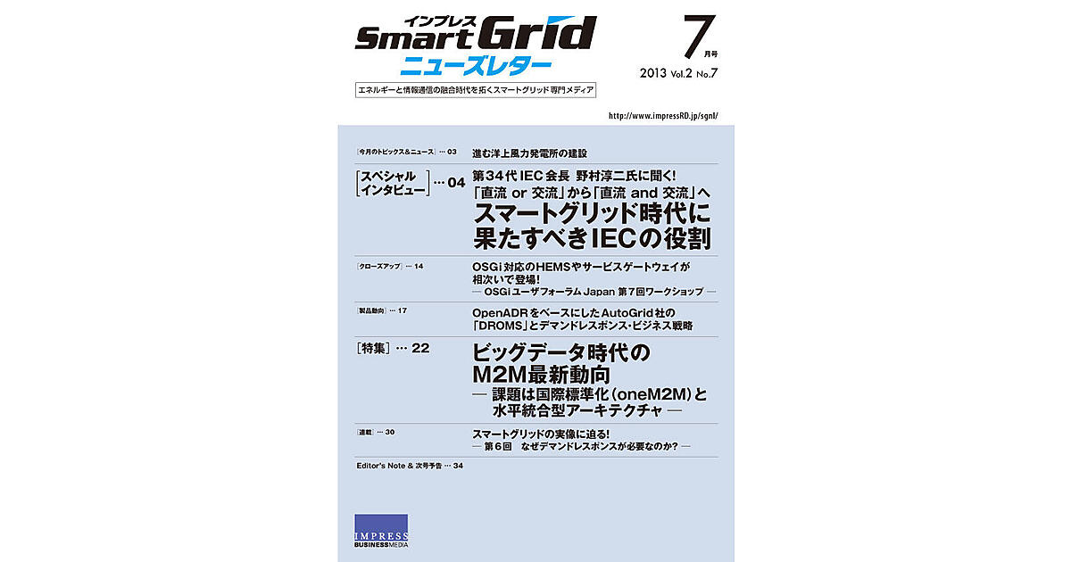 2013年7月号 スマートグリッドの実像に迫る! 2013年7月1日 0:00 スマートグリッド 特集 ビッグデータ時代のM2M最新動向 インプレスSmartGridニューズレター編集... 2013年7月1日 0:00 IoT OpenADRをベースにしたAutoGrid社の「DROMS」とデマンドレスポンス・ビジネス戦略 インプレスSmartGridニューズレター編集... 2013年7月1日 0:00 スマートグリッド プロダクト OSGi対応のHEMSやサービスゲートウェイが相次いで登場! インプレスSmartGridニューズレター編集... 2013年7月1日 0:00 スマートグリッド クローズアップ 進む洋上風力発電所の建設 インプレスSmartGridニューズレター編集... 2013年7月1日 0:00 再生可能エネルギー トピックス 「直流 or 交流」から「直流 and 交流」へスマートグリッド時代に果たすべきIECの役割 インプレスSmartGridニューズレター編集... 2013年7月1日 0:00 標準化