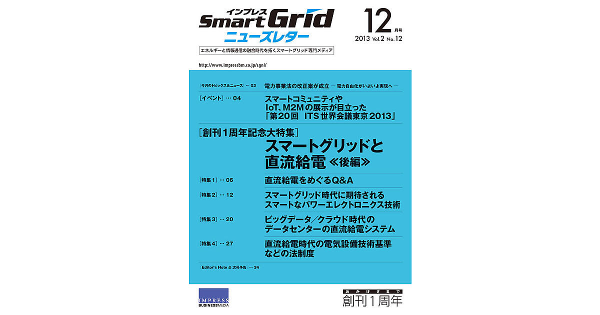 2013年12月号 特集 直流給電時代の電気設備技術基準などの法制度 インプレスSmartGridニューズレター編集...2013年12月1日 0:00 スマートグリッド 特集 ビッグデータ/クラウド時代のデータセンターの直流給電システム インプレスSmartGridニューズレター編集...2013年12月1日 0:00 スマートグリッド 特集 スマートグリッド時代に期待されるスマートなパワーエレクトロニクス技術 インプレスSmartGridニューズレター編集...2013年12月1日 0:00 スマートグリッド 特集 直流給電をめぐるQ&A インプレスSmartGridニューズレター編集...2013年12月1日 0:00 スマートグリッド スマートグリッドと直流給電 スマートグリッドと直流給電 ― 後編 ― 平田 英成2013年12月1日 0:00 スマートグリッド スマートコミュニティやIoT、M2Mの展示が目立った「第20回 ITS世界会議東京2013」 インプレスSmartGridニューズレター編集...2013年12月1日 0:00 IoTイベント 電力事業法の改正案が成立 インプレスSmartGridニューズレター編集...2013年12月1日 0:00 政策トピックス