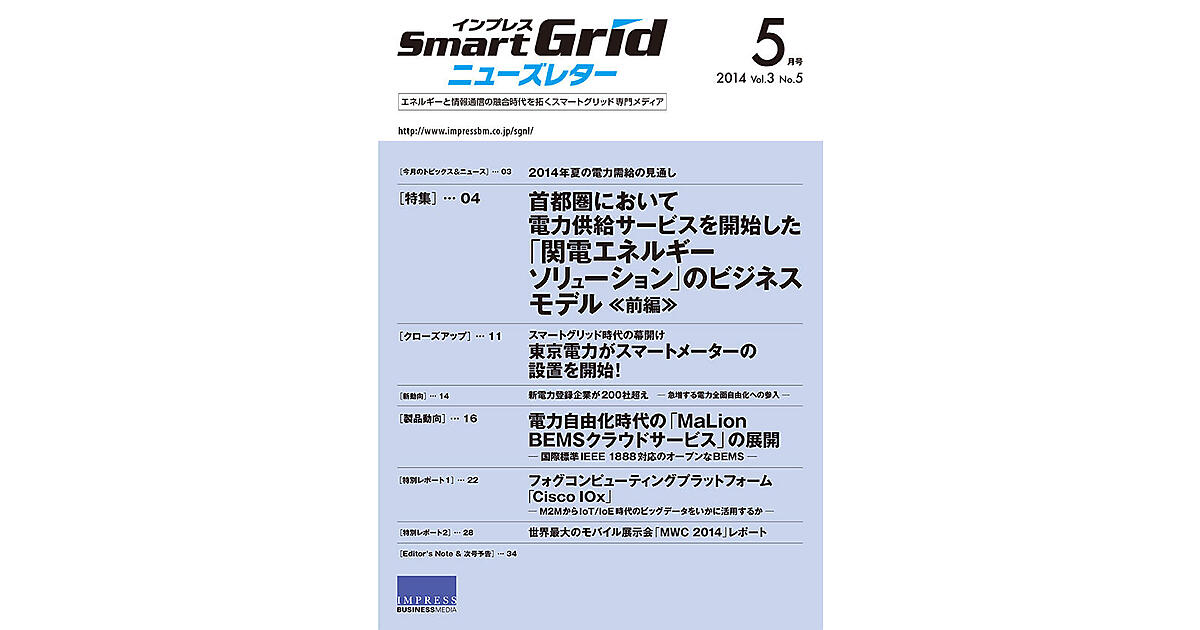 2014年5月号 産業変革を起こすM2M/IoTの普及 インプレスSmartGridニューズレター編集...2014年5月1日 0:00 IoTイベント 特別レポート フォグコンピューティングプラットフォーム「Cisco IOx」 インプレスSmartGridニューズレター編集...2014年5月1日 0:00 IoT 電力自由化時代の「MaLion BEMSクラウドサービス」の展開 インプレスSmartGridニューズレター編集...2014年5月1日 0:00 政策プロダクト 新電力登録企業が200社超え インプレスSmartGridニューズレター編集...2014年5月1日 0:00 政策新動向 スマートグリッド時代の幕開け東京電力がスマートメーターの設置を開始! インプレスSmartGridニューズレター編集...2014年5月1日 0:00 スマートグリッドクローズアップ 2014年夏の電力需給の見通し インプレスSmartGridニューズレター編集...2014年5月1日 0:00 政策トピックス 特集 首都圏において電力供給サービスを開始した「関電エネルギーソリューション」のビジネスモデル ─ 前編 ─ インプレスSmartGridニューズレター編集...2014年5月1日 0:00 政策