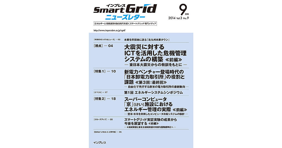 2014年9月号 スマートグリッド実証実験の成果から今後を展望する≪前編≫ インプレスSmartGridニューズレター編集...2014年9月1日 0:00 スマートグリッド スーパーコンピュータ「京」施設におけるエネルギー管理の実際 スーパーコンピュータ「京」(けい)施設におけるエネルギー管理の実際≪前編≫ インプレスSmartGridニューズレター編集...2014年9月1日 0:00 エネルギー管理 《第1回エネルギーシステムシンポジウムレポート》 インプレスSmartGridニューズレター編集...2014年9月1日 0:00 スマートグリッドイベント 「日本卸電力取引所」の役割と課題 新電力ベンチャー登場時代の「日本卸電力 取引所」の役割と課題 ≪第3回:最終回≫ インプレスSmartGridニューズレター編集...2014年9月1日 0:00 スマートグリッド 水素を市街地に送る「北九州水素タウン」 平田 英成2014年9月1日 0:00 EV(BEV)トピックス 大震災に対するICTを活用した 危機管理システムの構築 大震災に対するICTを活用した危機管理システムの構築≪前編≫ 野口 正一 公益財団法人仙台応用情報学研究振興...2014年9月1日 0:00 IoT