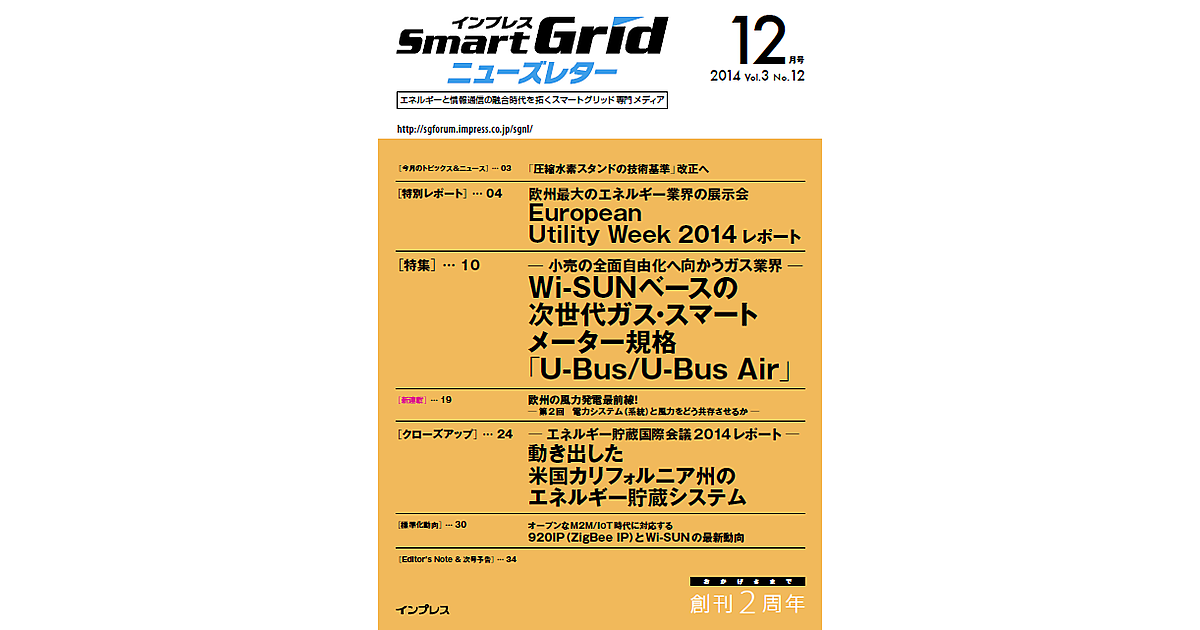 2014年12月号 「圧縮水素スタンドの技術基準」改正へ インプレスSmartGridニューズレター編集...2014年12月1日 0:00 EV(BEV)トピックス 特別レポート 「ビッグデータとの融合」と「電力網の自動管理」でスマートグリッドは新たなステージへ! インプレスSmartGridニューズレター編集...2014年12月1日 0:00 スマートグリッド 特別レポート Utility 2.0時代に求められる新サービスへの独創性 インプレスSmartGridニューズレター編集...2014年12月1日 0:00 スマートグリッド 特集 Wi-SUNベースの次世代ガス・スマートメータリングシステムの標準規格「U-Bus/U-Bus Air」 インプレスSmartGridニューズレター編集...2014年12月1日 0:00 標準化 【連載】最新! 世界のエネルギー政策 欧州の風力発電最前線 インプレスSmartGridニューズレター編集...2014年12月1日 0:00 再生可能エネルギー 動き出した米国カリフォルニア州のエネルギー貯蔵システム インプレスSmartGridニューズレター編集...2014年12月1日 0:00 蓄電池クローズアップ オープンなM2M/IoT時代に対応する920IP(ZigBee IP)とWi-SUNの最新動向 インプレスSmartGridニューズレター編集...2014年12月1日 0:00 IoT