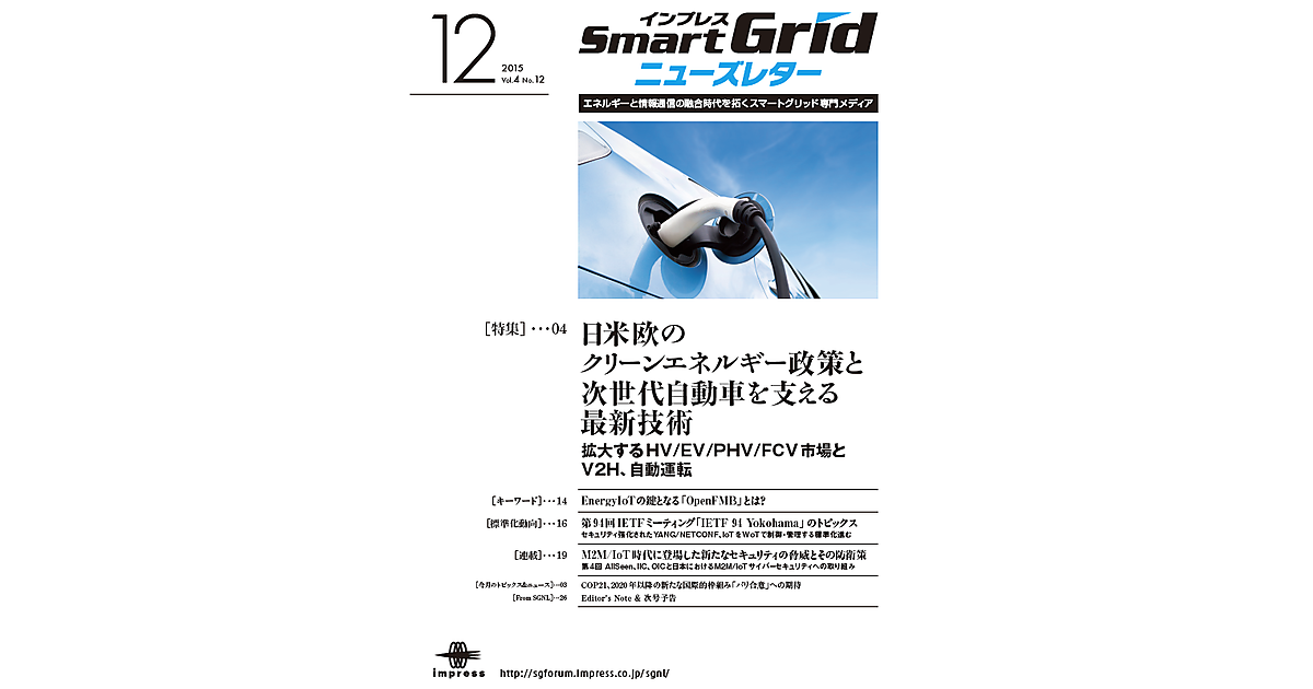 2015年12月号 COP21、2020年以降の新たな国際的枠組み「パリ合意」への期待 インプレスSmartGridニューズレター編集...2015年11月30日 0:00 スマートグリッドトピックス 特集 日米欧のクリーンエネルギー政策と次世代自動車を支える最新技術 インプレスSmartGridニューズレター編集...2015年11月30日 0:00 スマートグリッド EnergyIoTの鍵となる「OpenFMB」とは? 新井 宏征 株式会社スタイリッシュ・アイデア ...2015年11月30日 0:00 スマートグリッド 第94回IETFミーティング「IETF 94 Yokohama」のトピックス― セキュリティ強化されたYANG/NETCONF、IoTをWoTで制御・管理する標準化進む ― インプレスSmartGridニューズレター編集...2015年11月30日 0:00 スマートグリッド M2M/IoT時代に登場した新たなセキュリティの脅威とその防衛策 M2M/IoT時代に登場した新たなセキュリティの脅威とその防衛策― 第4回 AllSeen、IIC、OICと日本におけるM2M/IoTサイバーセキュリティへの取り組み ― 佐々木 弘志 インテル セキュリティ(マカフィ...2015年11月30日 0:00 スマートグリッド