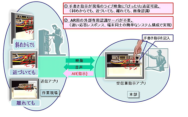 同システムは、当社開発の高速・軽量でマーカー不要なARエンジンを搭載している。これにより、作業中にカメラを動かしても、AR指示画像が追従し、ピタリと重なるため、遠隔作業指示における認識のズレを軽減でき、作業ミスを削減することが可能。リアルタイムの映像にAR画像を重ねて表示する遠隔作業支援システムの商用化は世界初注3となる。 高速・軽量化の実現により、従来必要であったAR専用サーバーが不要となったため、スマートフォン・タブレット本体とソフトウェアだけで、特別なシステム構築費用なしに使用が可能。