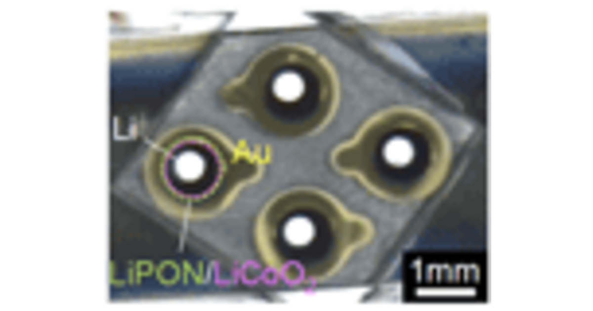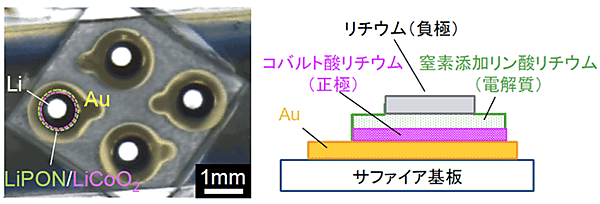 図1に、全固体薄膜電池素子の写真と断面の概略図を示す。各素子は、コバルト酸リチウム(正極)、窒素添加したリン酸リチウム(電解質)、リチウム(負極)の積層薄膜で構成され、試料を一度も大気暴露することなく電池構造を作製するため、理想的な電極/電解質界面を作製することができた。
