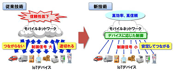 今回開発した通信技術は、通信事業者のネットワークとIoTデバイスの間の制御信号を最適に制御し、今後爆発的に増加していくさまざまなIoTデバイスをモバイルネットワークの負荷を抑えて接続できるものとなっている。