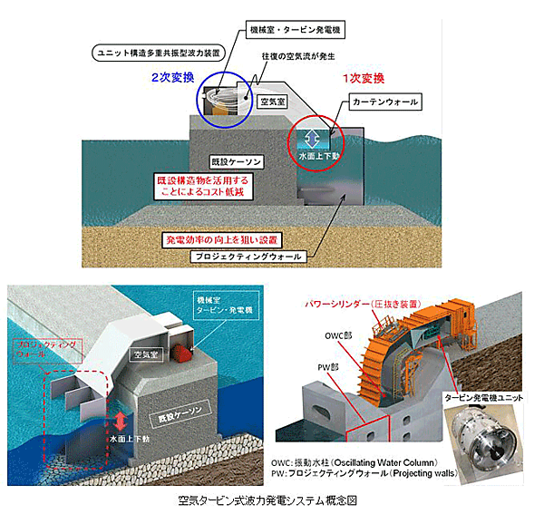 2015年4月17日、国立研究開発法人新エネルギー・産業技術総合開発機構(以下:NEDO)は、海洋エネルギー技術研究開発プロジェクトの一環として空気タービン式波力発電システムを開発、山形県酒田港の護岸にて実証試験を開始したことを発表した。