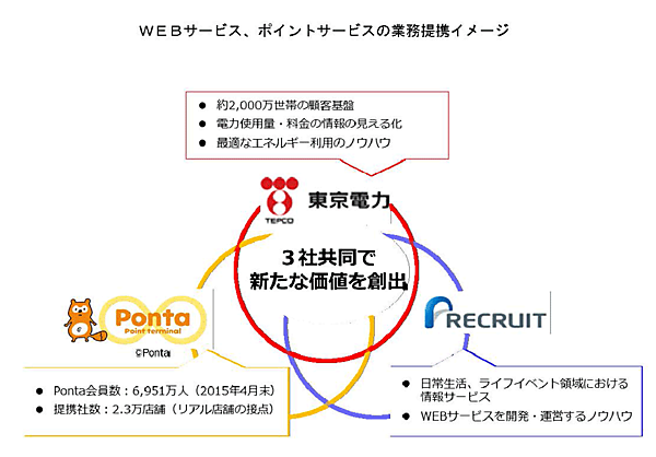 この業務提携では、約2,000万世帯の顧客基盤を有する東京電力、日常生活やライフイベントに関連したサービスを多数展開しているリクルート、全国に6,951万人の会員と79社(2.3万店舗)の提携事業者を有し、日常生活に密着した共通ポイントサービス「Ponta」(ポンタ)を展開しているロイヤリティマーケティングの3社が共同で、2016年1月以降、エネルギーと住まいを中心にした新たなWebサービスやポイントサービスの提供を予定している。これにより、現在、東京電力が提供中の無料Web会員サイト「でんき家計簿」(約270万会員)を進化させ、「暮らしのプラットフォーム」(仮称、2016年1月サービス開始予定)の実現を目指す。