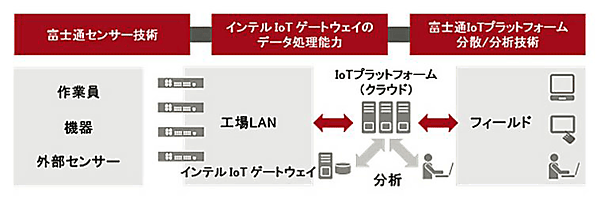 同技術を用いた分散サービス基盤の効果を最大限に引き出すためには、センター側にすべての処理を集中させず、ゲートウェイ側で一部を行うことが必要となる。インテルIoTゲートウェイは、インテルプロセッサーとソフトウェアとの組み合わせを事前に統合・検証することで優れた処理能力、セキュリティ、確証性を備えており、本ゲートウェイに富士通の分散サービス基盤技術を組み合わせることで、短期間でのシステム環境の構築を可能にする。また、データ量のリアルタイムな変化に対応したシステムの拡張・変更が可能になるとともに、サーバやパソコンなどデータ処理を行うハードウェアの数を削減することが可能となり、システム全体のコスト負担の低減が期待できる。