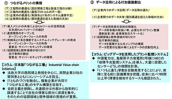 同報告書では、「製造業の新たな展開と将来像」(第3節)については、「ITの急速な技術革新により、データの蓄積と活用の幅が拡大。データ収集、解析、処理というサイクルの中で新たな付加価値が生み出され、あらゆる分野で競争領域が変化」とされる一方で、「我が国のIT技術者の分布状況は米国と比較してITサービス企業に大きく偏っている」と製造業におけるIT利活用が進んでいない現状を指摘する。その様な国内の状況下においも、製造業におけるIoTを「単なる生産の効率化を超えたIoT活用によって、製造業のビジネスモデルが変革しつつある」と重視し、「日本企業もより積極的にIoTを活用し、そのメリットを享受すべき」と位置づける。