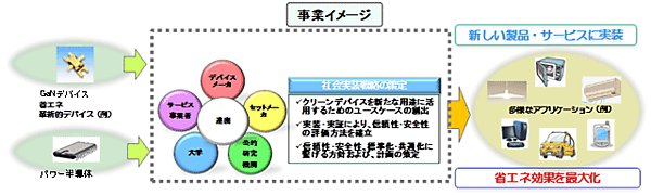 同事業は、省エネルギーに資するクリーンデバイス(高周波半導体、不揮発メモリ、光エレクトロニクス技術、低電力LSI、パワーデバイス、環境発電デバイスなどの省エネルギーに資する革新的デバイス)を、従来利用を想定してきた機器などだけではなく、さまざまな製品・サービスへと拡大し、省エネルギー効果を最大限に活用することを目的に2014年度から5テーマの実証事業を開始している。