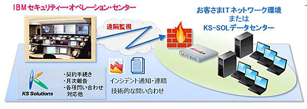 「FireEye」を導入した企業向けに、KS-SOLが提供する運用監視サービスとして提供する。バックグラウンドには、日本IBMのセキュリティ専門技術者による24時間365日の有人運用監視サービス「IBM Managed Network Security Services(以下:IBM MNSS)」を利用する。「IBM MNSS」は、東京を含む世界10拠点のIBMセキュリティ・オペレーション・センター(SOC)において導入ユーザーのサイトのセキュリティ機器を運用監視を行う。