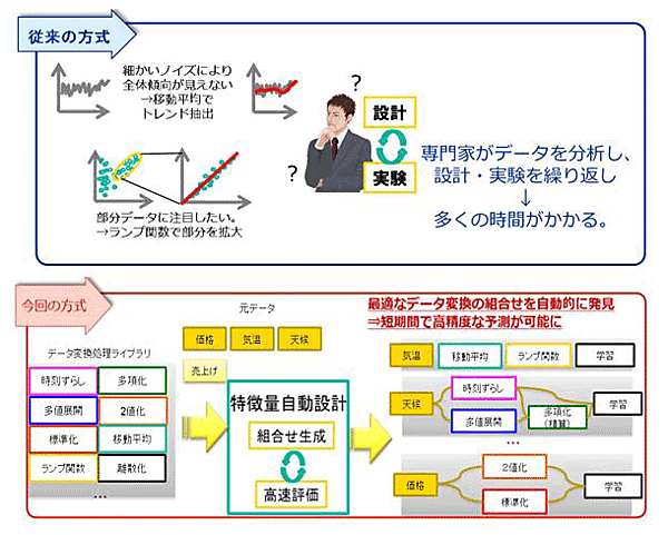2015年8月18日、日本電気株式会社(以下:NEC、東京都港区、執行役員社長:遠藤信博)は、ビッグデータの予測分析における事前のデータ処理を行う技術として、予測に役立つ特徴的なデータ(以下:特徴量※1)の生成と、その評価を自動化する「特徴量自動設計技術」を開発したことを発表した。