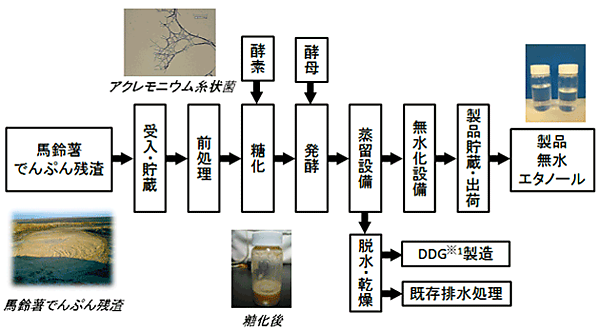 一般にバイオマスのエタノール化は、酵素による糖化を経て酵母によるエタノール発酵を行うが、馬鈴薯でんぷん残渣はでんぷん質とセルロースが複雑に絡み合った構造をもち、一般の酵素では糖化できない課題があった。これに対し今回実証に用いるアクレモニウム糸状菌は、分泌する複合酵素によって馬鈴薯でんぷん残渣を分解(糖化)するので、エタノール製造が可能である。