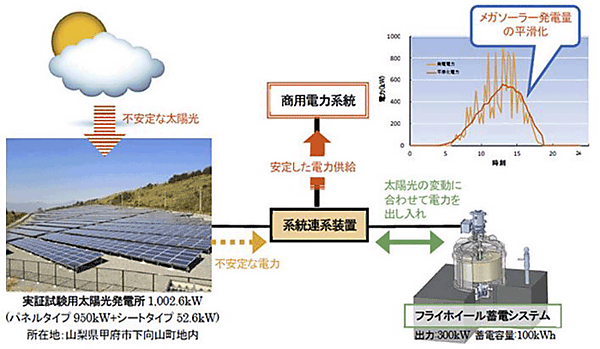 2015年9月3日、公益財団法人鉄道総合技術研究所(以下:鉄道総合研究所、東京都国分寺市、理事長:熊谷則道)、クボテック株式会社(以下:クボテック、大阪市北区、取締役社長:久保哲夫)、古河電気工業株式会社(以下:古河電工、東京都千代田区、社長:柴田光義)、株式会社ミラプロ(以下:ミラプロ、山梨県北杜市、代表取締役社長:津金洋之)および山梨県は、国立研究開発法人新エネルギー・産業技術総合開発機構(以下:NEDO)の「安全・低コスト大規模蓄電システム技術開発」プロジェクトにおいて、世界最大級の次世代フライホイール蓄電システム実証機を、山梨県が運営する米倉山大規模太陽光発電所と電力系統に連系させて実証試験を行う施設を完成させたことを発表した。