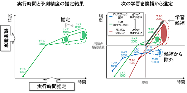 同社の開発した技術は、少量のサンプルデータと過去の予測モデルの精度から機械学習結果を推定し、もっとも精度の高い結果の得られる学習アルゴリズムや動作条件の組み合わせを抽出して、大規模データの学習に適用する。これにより、5,000万件規模のデータであっても数時間で精度の高い予測モデルを得ることが可能となる。