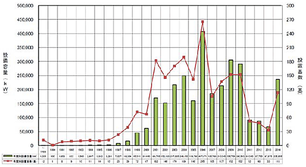 図2 日本における年度別風力発電導入量の推移(当該年度内の廃止・撤去は含まず)