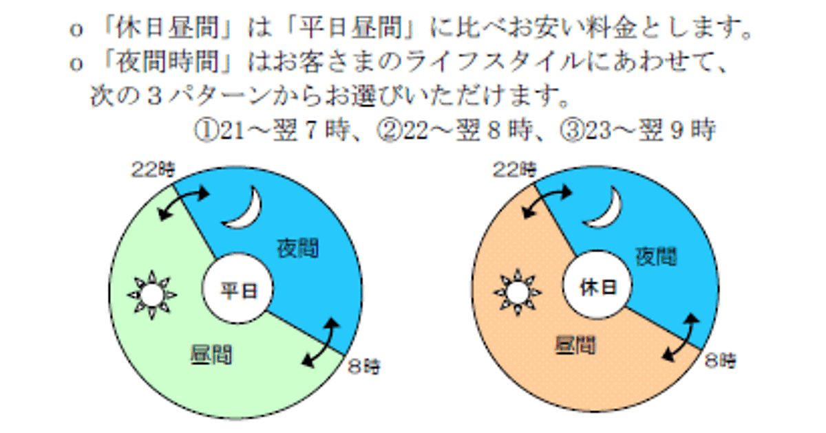季時別電灯:使用量の料金単価を2季節(夏季/その他季)3時間帯(デイタイム/リビングタイム/ナイトタイム)に分けて設定している(デイタイムは割高、ナイトタイムは割安になっている)。電気の使用をデイタイムからリビングタイム/ナイトタイム、またはリビングタイムからナイトタイムに移すことにより、電気料金が割安になるメニュー。