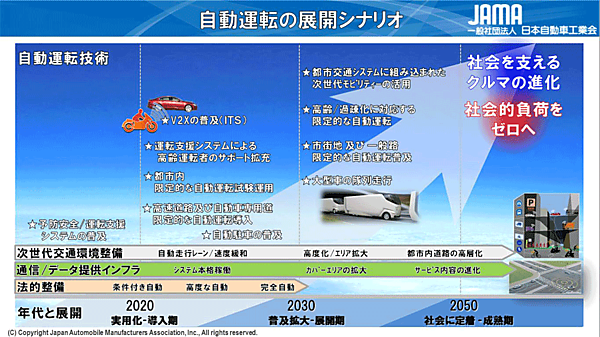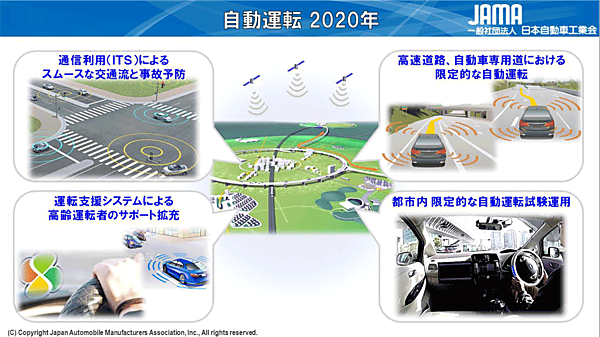 2015年11月6日、一般社団法人日本自動車工業会(以下:自工会、東京都港区、会長:池 史彦)は、第44回東京モーターショー2015の会期中に東京ビッグサイトにて、「自動運転は、クルマを、くらしを、社会をどう変えていくのか」と題し、「SMART MOBILITY CITY 2015 国際シンポジウム」開催し、同会がとりまとめた「自動運転ビジョン」を発表した。