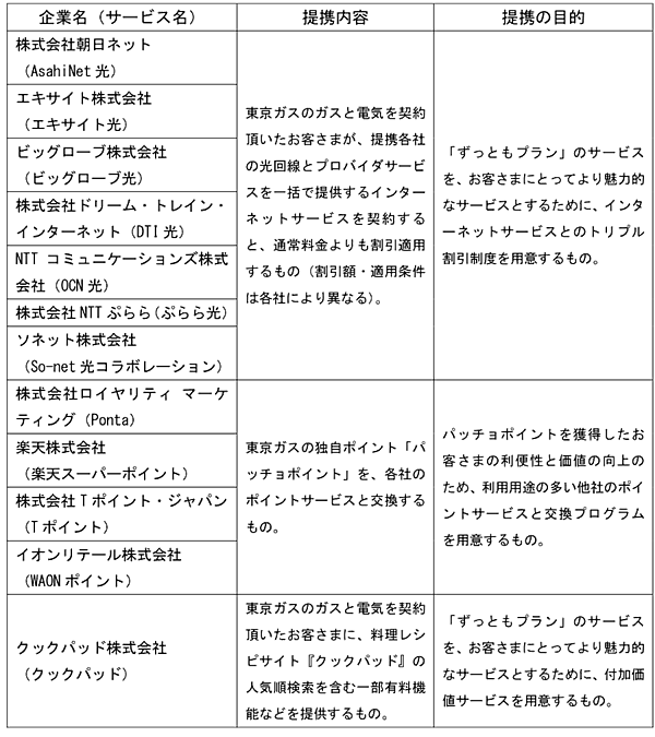 2015年12月24日、東京ガス株式会社(以下:東京ガス、東京都港区、代表取締役社長:広瀬 道明)は、2016年4月の家庭用や業務用の顧客向け低圧電力の販売開始に向け、総合エネルギーに関するサービスプラン「ずっともプラン」を決定するとともに、付加価値サービス提供に関して、複数の企業との業務提携を締結したことを発表した。