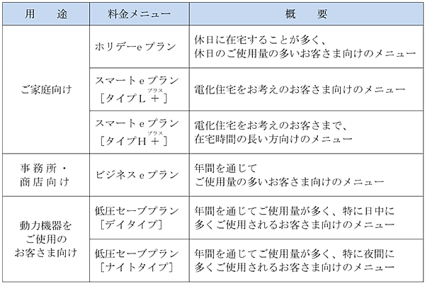 出所:四国電力 Webサイト リリースより抜粋。 ※料金上記各メニューの料金単価等の詳細はリンクを参照。