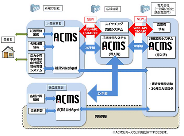 「ACMSシリーズ」では、既に、電気事業者が各種計画情報を広域機関に提出する際のシステム連携もサポートしており、また、Webアプリケーションのブラウザ操作を自動化するオプション製品「ACMS WebAgent」では、新電力会社が行う同時同量に必要な30分電力量データを、一般送配電事業者Webアプリケーションからのダウンロードを行うこともできる。これらの3つの仕組みをACMSシリーズがワンパッケージで統合運用することで、運用効率を上げるのはもちろん運用コストを大幅に削減する。